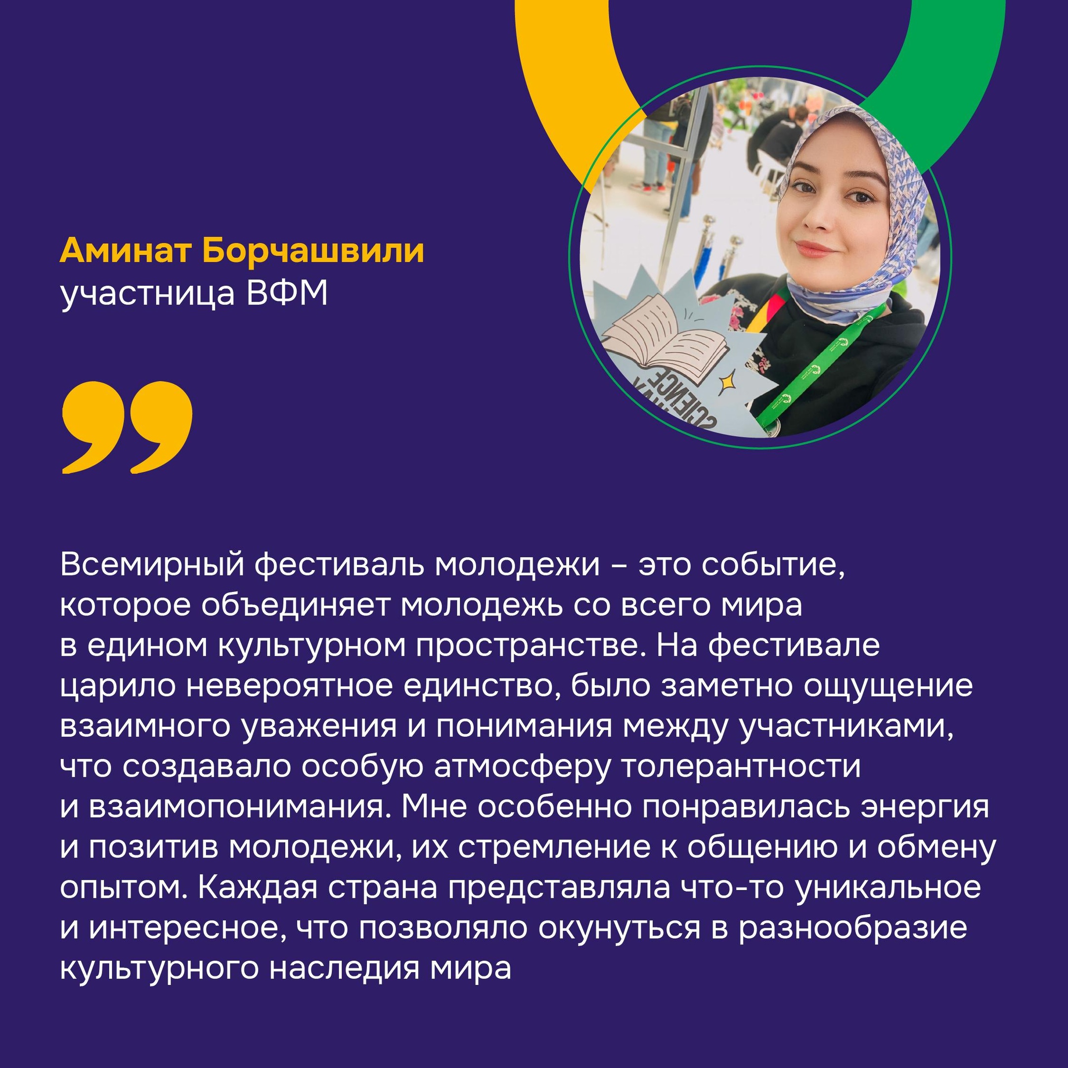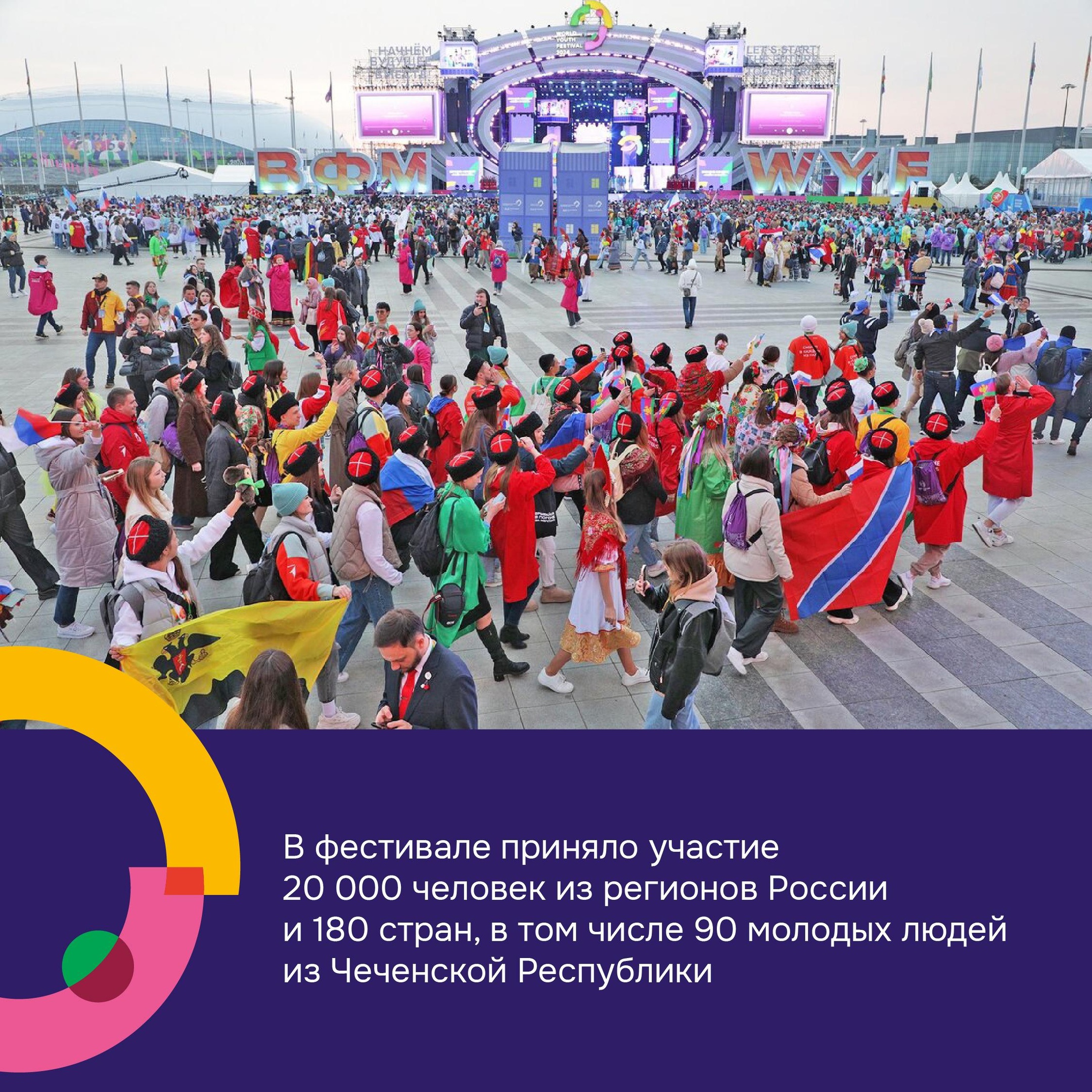 В Сочи завершился Всемирный фестиваль молодежи, который проводился по указу Президента РФ. Он объединил 20 000 молодых людей из регионов России и 180 стран. Что о фестивале говорят участники из Чеченской Республики – смотрите в карточках
