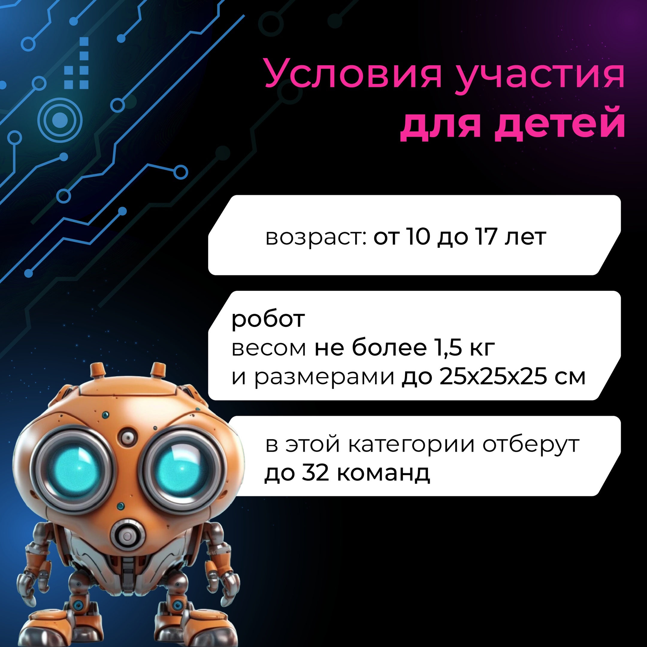 06.03.2024Создай своего робота и вступи в «Битву роботов»Это не только зрелищный чемпионат, но и международная площадка обмена опытом в робототехнике.Твоя задача: сконструировать робота в соответствии с требованиями категории, ведь от него зависит твоя победа. После этого управляй им и демонстрируй свои технические навыки в поединках!В каждой команде могут участвовать от 1 до 5 человек. Не упусти свой шанс – подавай заявку до 10 марта.Зарегистрируйся сейчас и узнай все детали по ссылке https://clck.ru/39ERUQ