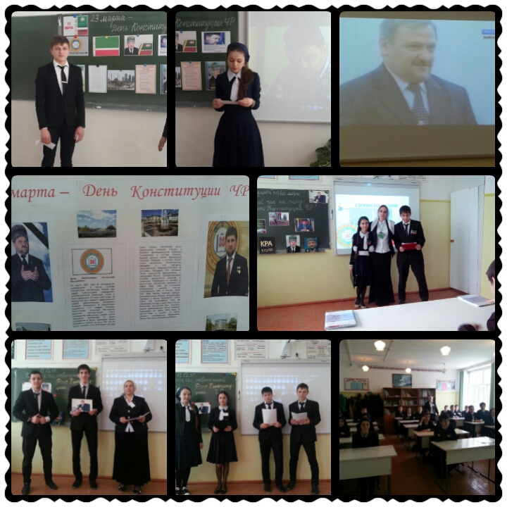 С 16 по 22 марта в школе проведены беседы, открытые классные часы, посвященные Дню Конституции Чеченской Республики. Выпущена газета "23 марта- День Конституции ЧР".