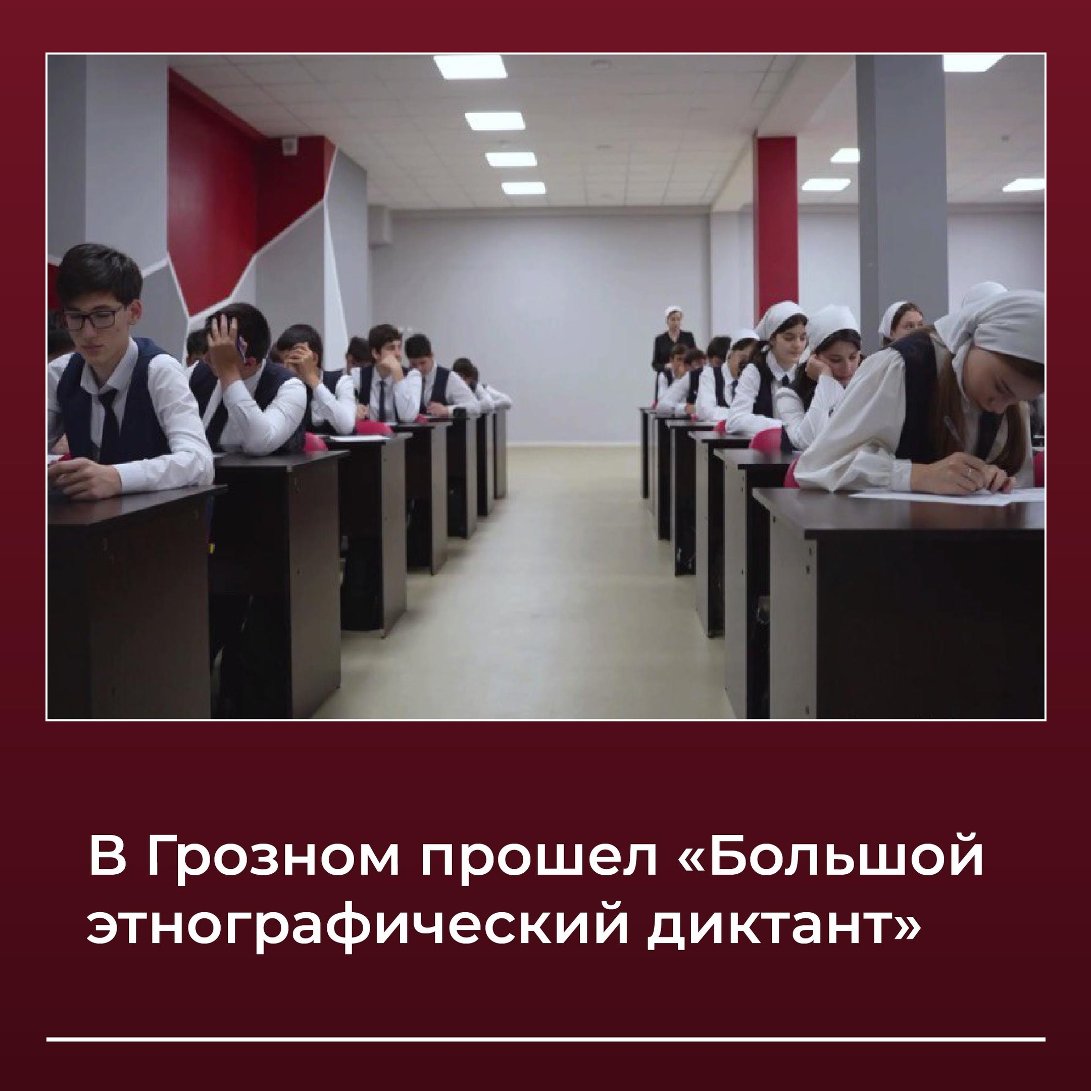10.11.2024В рамках реализации федерального проекта "Социальная активность" нацпроекта "Образование" с 1 ноября 2024 года стартовала lХ Всероссийская просветительская акция "Большой этнографический диктант".Диктант в ЧР проходит по инициативе Федерального агентства по делам национальностей при поддержке Министерства образования и науки Чеченской Республики и Института чеченского языка.4 ноября на базе Гимназии № 5 г. Грозного диктант написали 80 человек. Участники ответили на 30 вопросов: 20 - общих для всех, и 10 - уникальных для каждого субъекта России. Вопросы для зарубежных участников касались мест, связанных с Россией, за её пределами. Участники младше 16 лет отвечали только на 20 общероссийских вопросов.Максимальный балл за выполнение всех заданий составляет 100, а на их выполнение отводилось 45 минут. Результаты будут доступны на сайте диктанта до 13 ноября 2024 года.