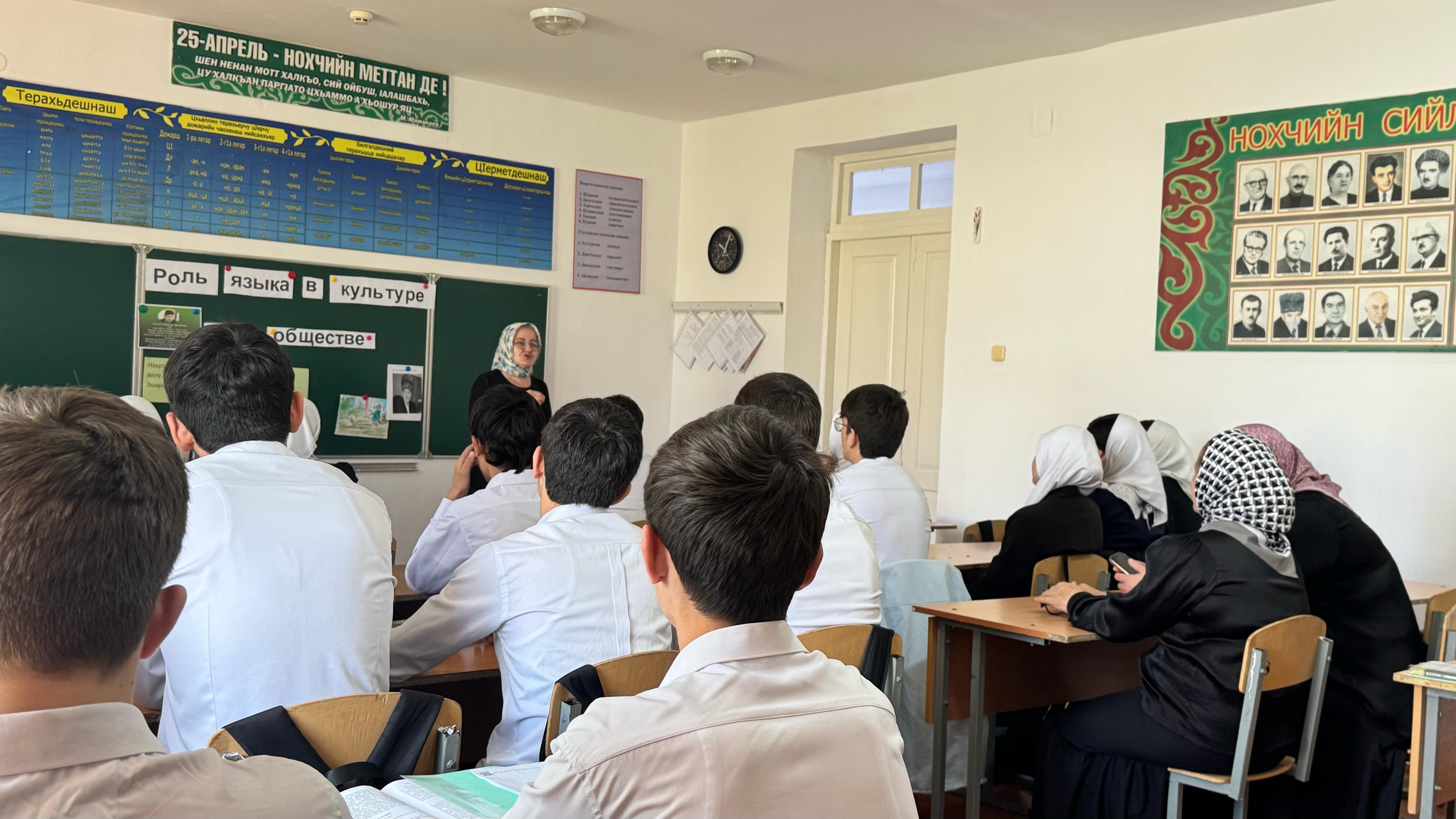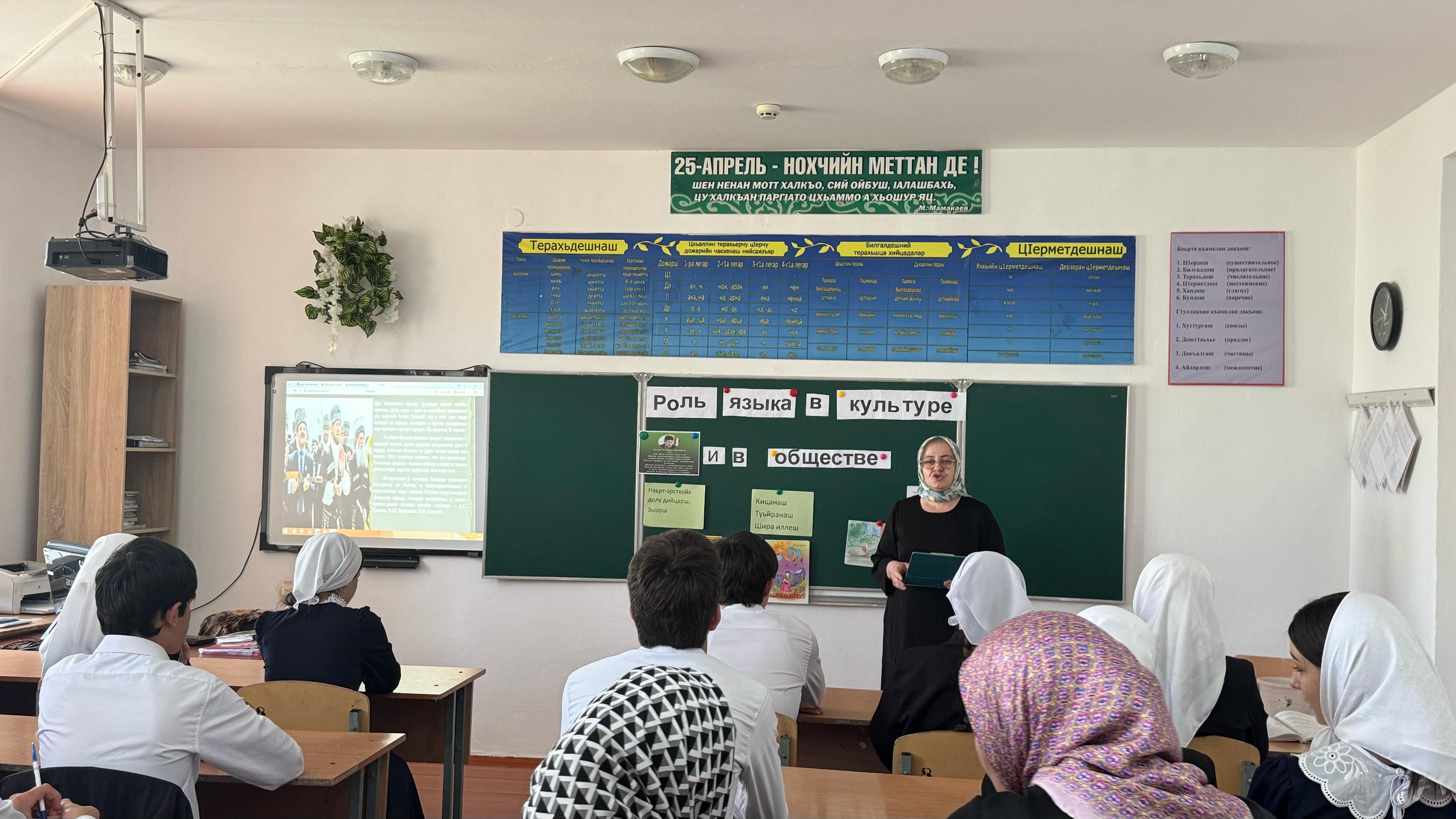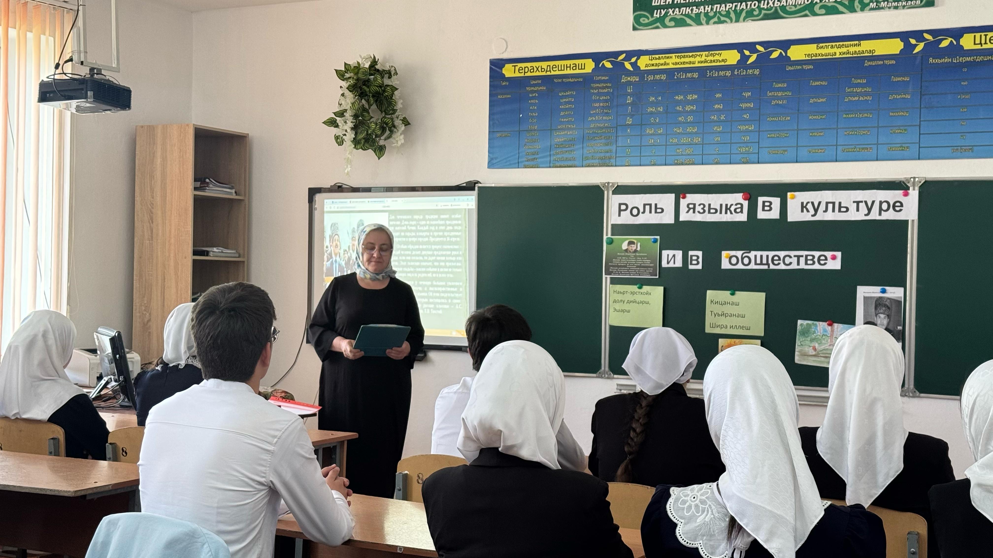 В МБОУ"Харьковская СОШ" в рамках празднования Дня чеченского языка, учитель чеченского языка и литературы Усманова Ш.И. провела открытую лекцию на тему «Роль языка в культуре и обществе». Лекция была посвящена значимости языка как фундаментальной основы культуры, инструмента познания мира и важнейшего средства коммуникации.