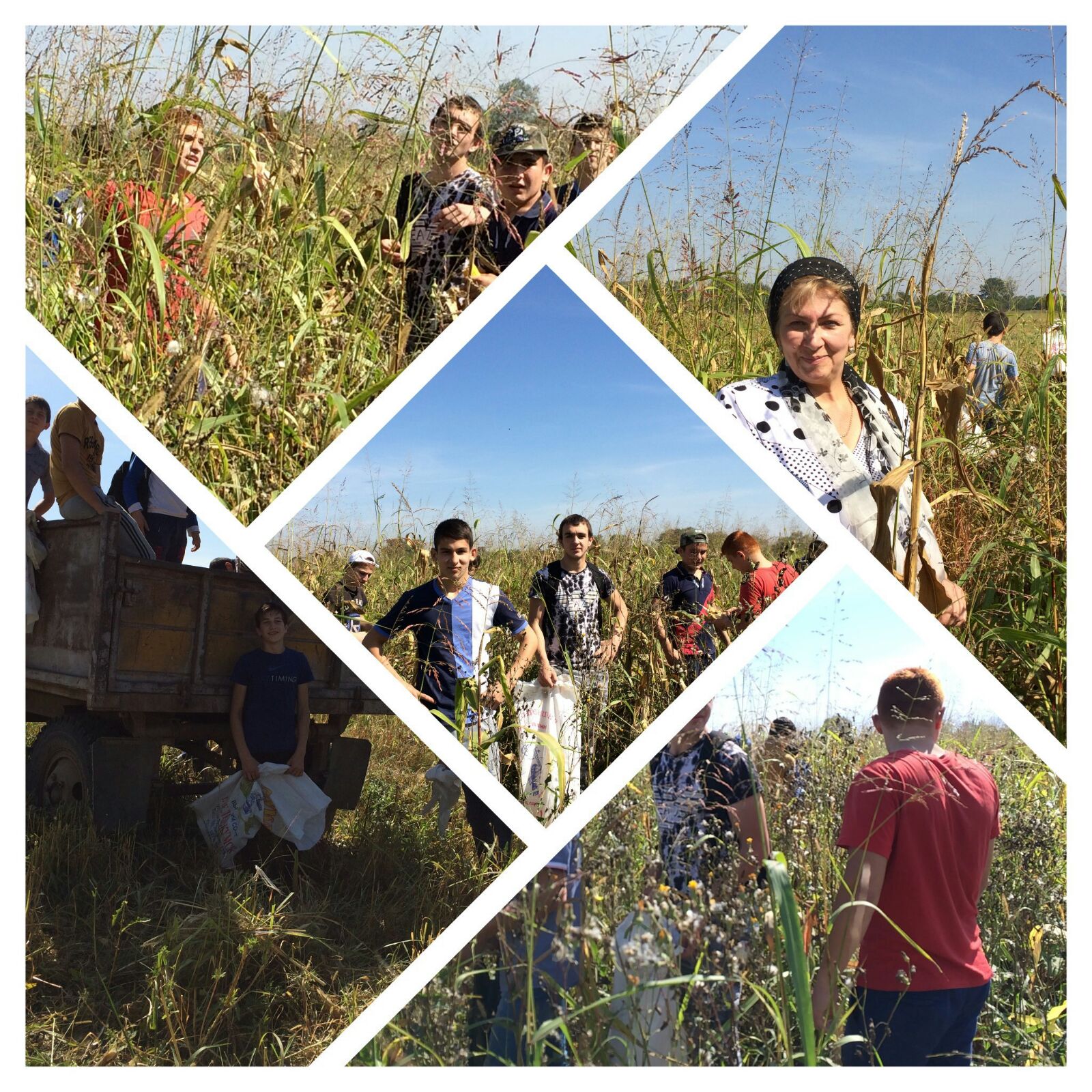 Ученическая проиводственная бригада с зам. директора по УВР Альтиговой З.В. на сборе урожая.