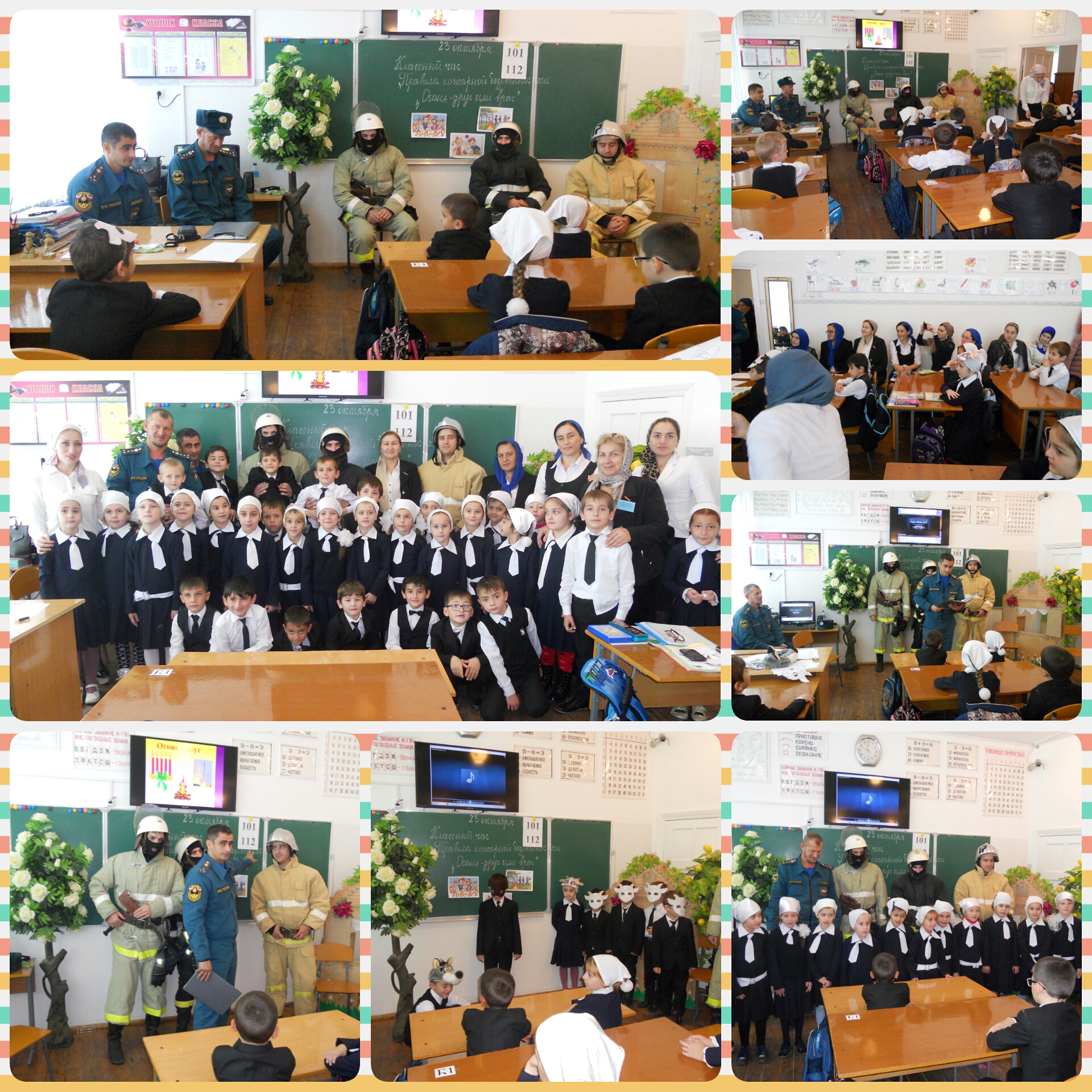 23.10.2015Классный час по правилам пожарной безопасности в 1 "Г" классе - классный руководитель Ясаева Л.В., по теме "Огонь - друг или враг". Были приглашены инспектор по профилактике пожарной безопасности Баштыков Рустам Вахаевич и несколько работников МЧС. А также на классном часе пристствовали администрация и учителя нашей школы.