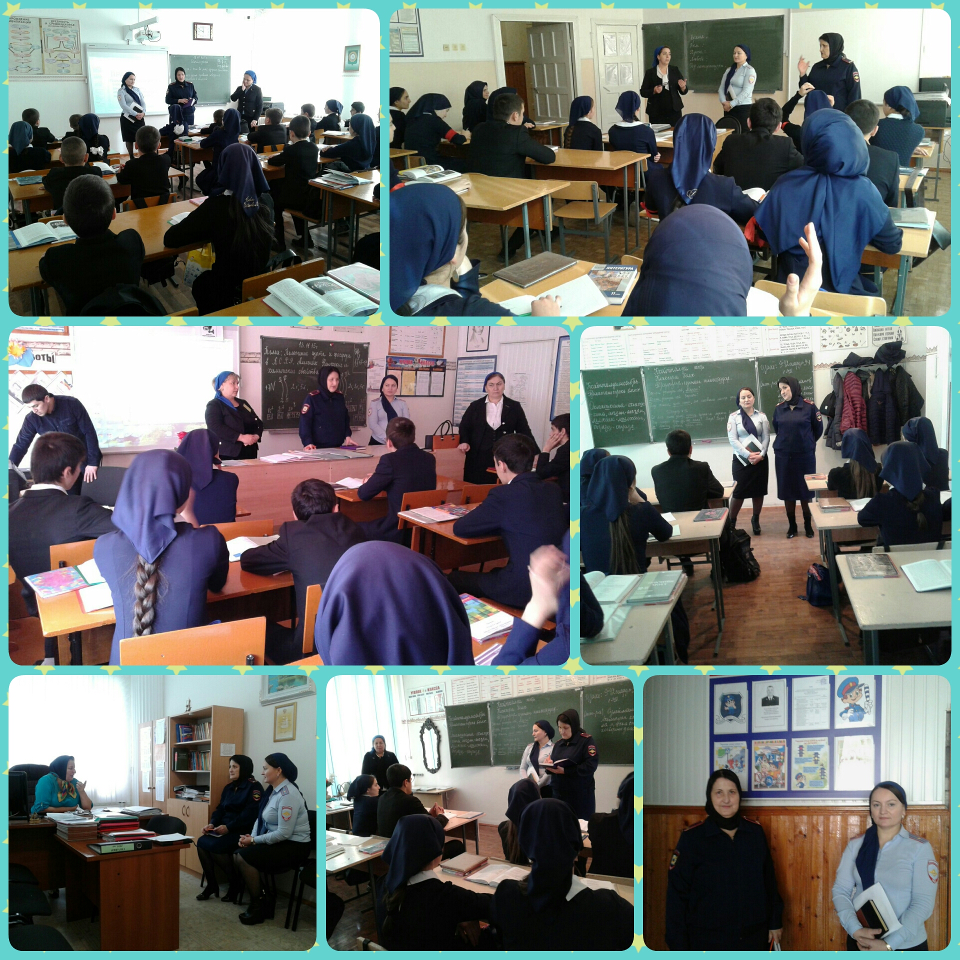 13.11.201513 ноября 2015 года начальник ПДН отдела МВД России по Урус-Мартановскому району майор полиции Адаева Э.С-А. и зам. начальника подполковник Мальсагова Р.С. провели с 5, 9,11 классами нашей школы беседы по темам: "Профилактика терроризма и экстремизма", "О вреде психотропных веществ", "О пагубном влиянии сети интернет на молодежь".