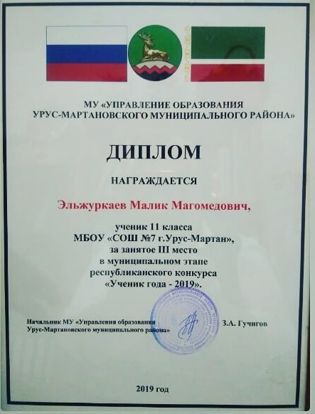 Эльжуркаев Малик, ученик 11 б класса, занял 3 место в муниципальном этапе Республиканского конкурса"Ученик года- 2019"